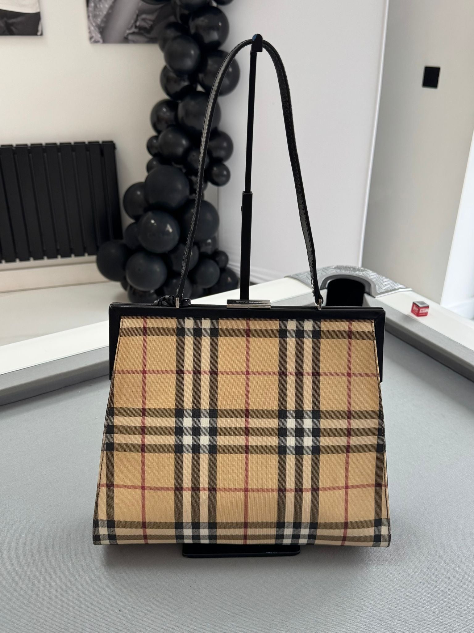 This Burberry bag is crafted in checked canvas and is finished with black patent leather. Wear this beauty in your hand, on your wrist or on your shoulder.