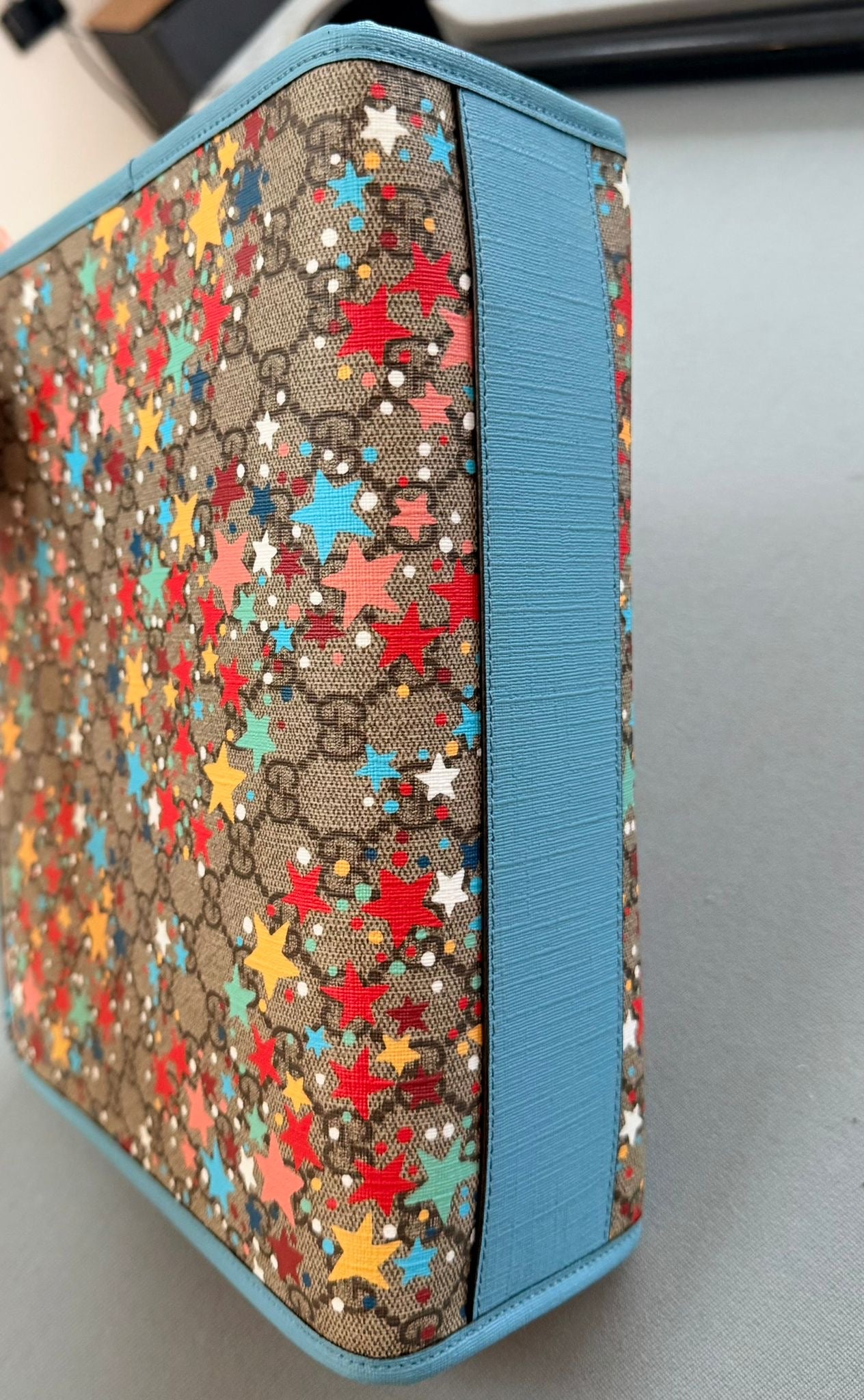 The bag features the signature beige and ebony GG Supreme canvas with a colorful all-over stars print and light blue Supreme canvas trim and handles.