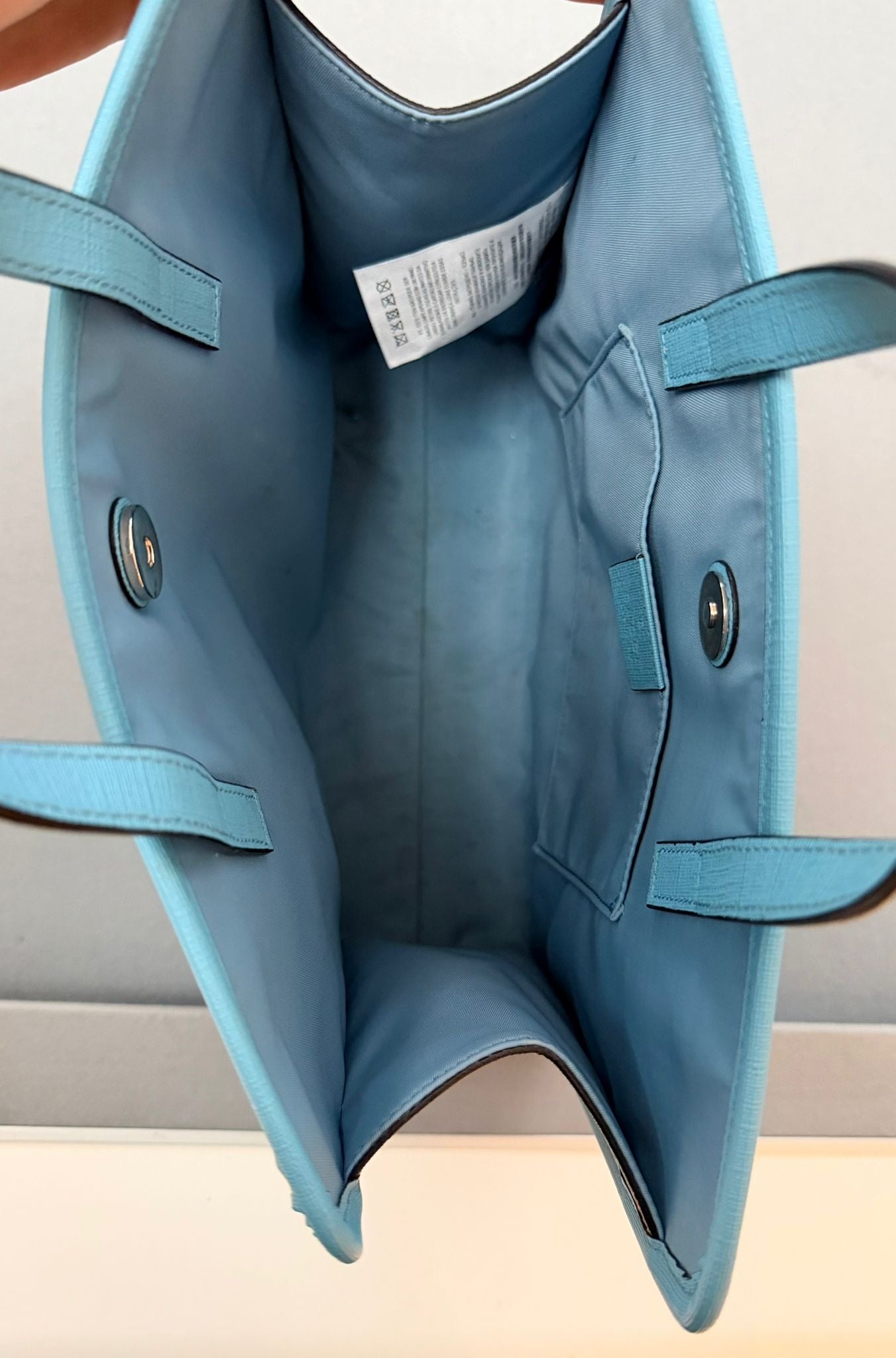 It includes double top handles, a magnetic snap button closure, and an internal open pocket.