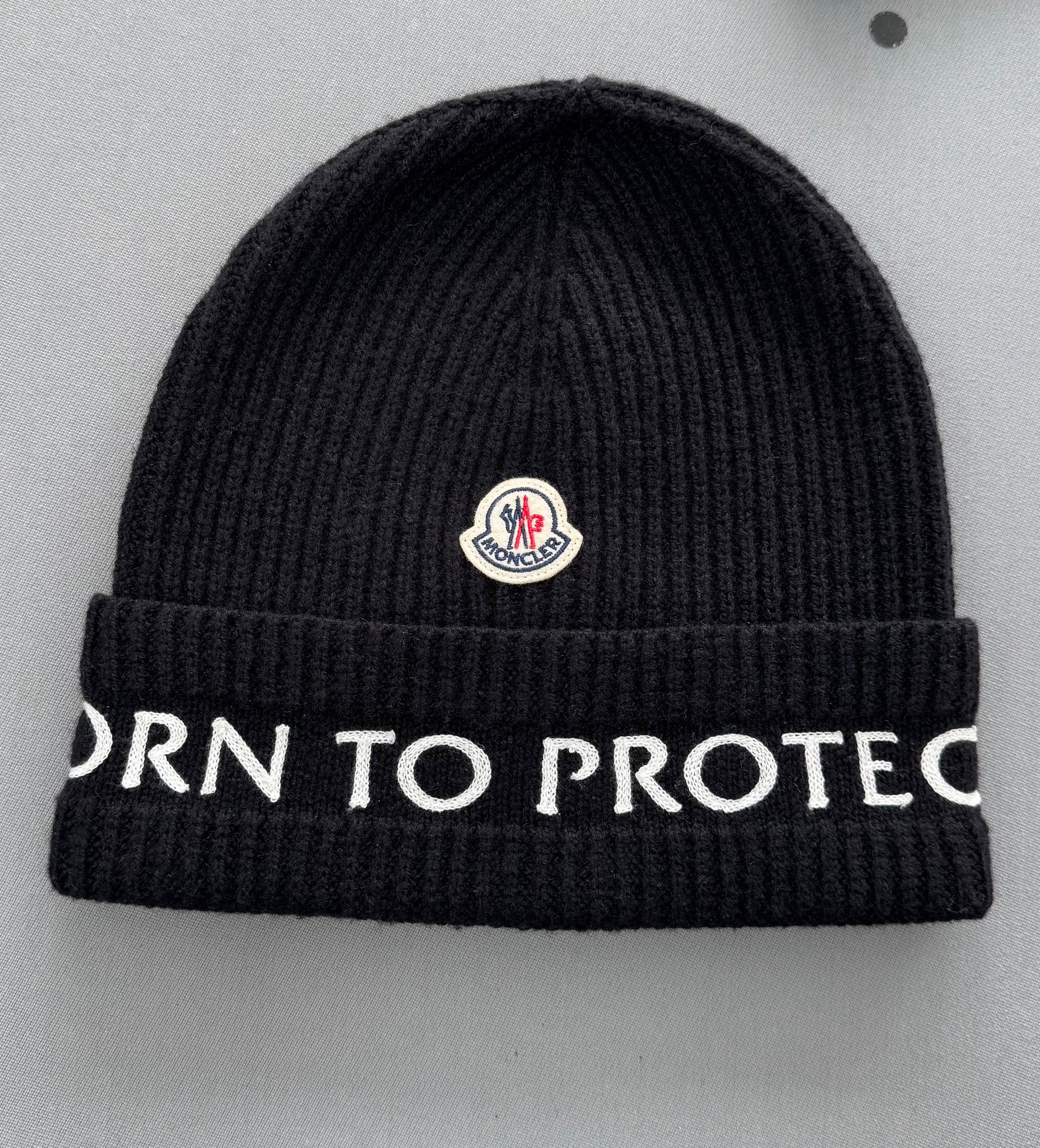 Moncler Black “ Born To Protect “ Tricot Wool Beanie