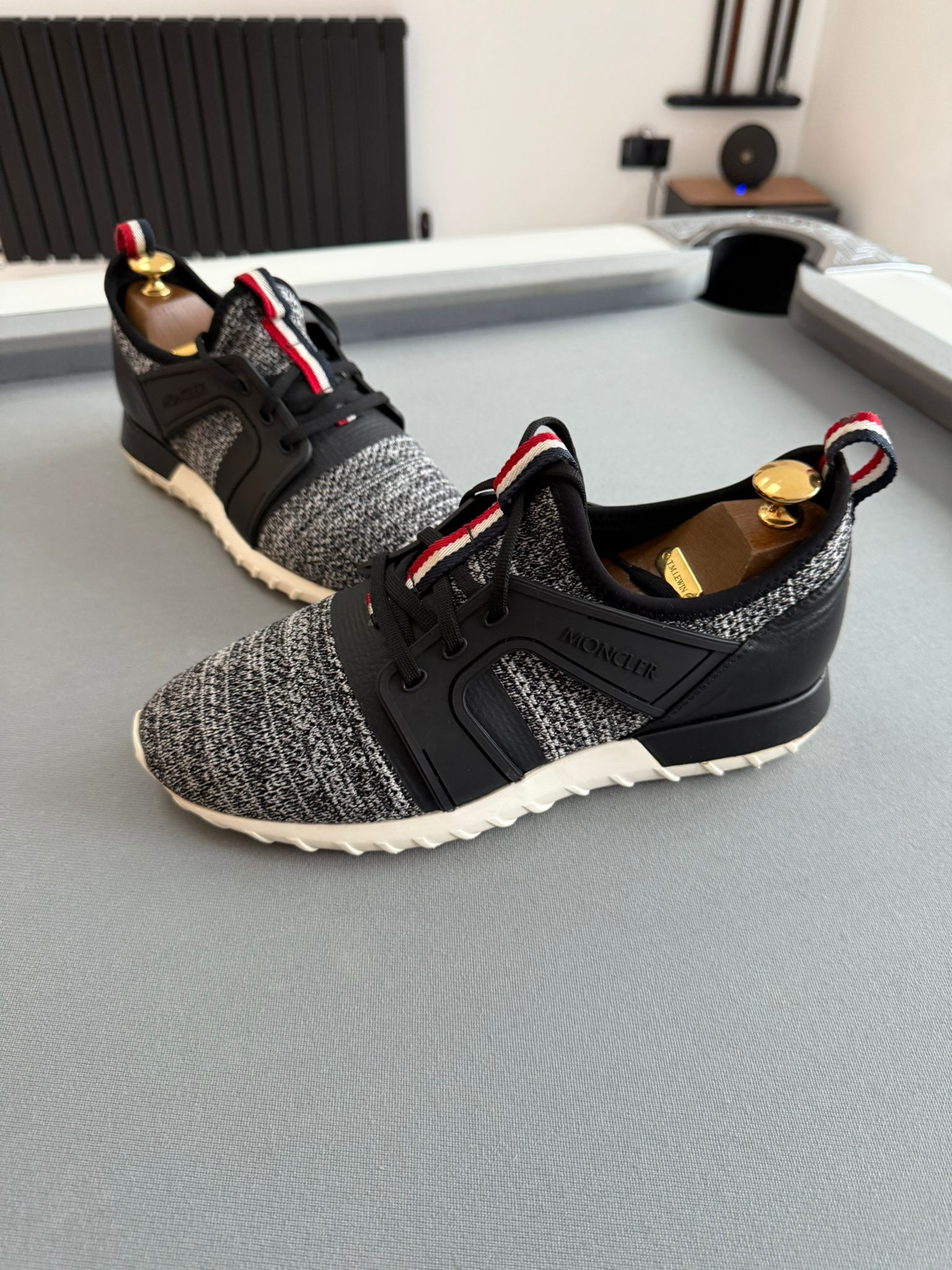 The heel counter features the signature Moncler red, white, and blue tricolor ribbon and logo. The upper is a blend of knit, polyamide, and elastane with leather and rubber inserts. The sole is elastodiene with an EVA midsole.