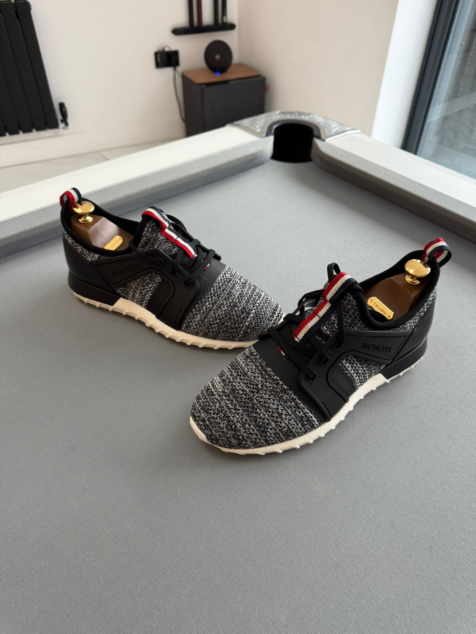Moncler Emilien low-top trainers in a black, white & grey knit mesh with a tricolor heel tab. They feature leather and rubber trims, a front lace-up fastening, and a white EVA Extralight outsole.