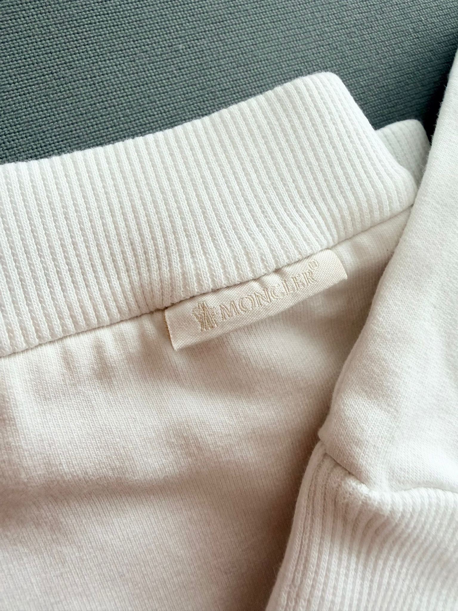 Cotton fleece sweatshirt and lounge pants set in white. Sweatshirt · Rib knit crewneck collar, cuffs, and hem · Nylon canvas graphic patch in red at chest · Kangaroo pocket · Press-stud fastening at shoulder for easy on and off · Felted logo patch at sleeve · Logo-engraved tonal hardware · Machine wash Lounge pants · Rib knit waistband and cuffs · Two-pocket styling · Mock-fly · Machine wash