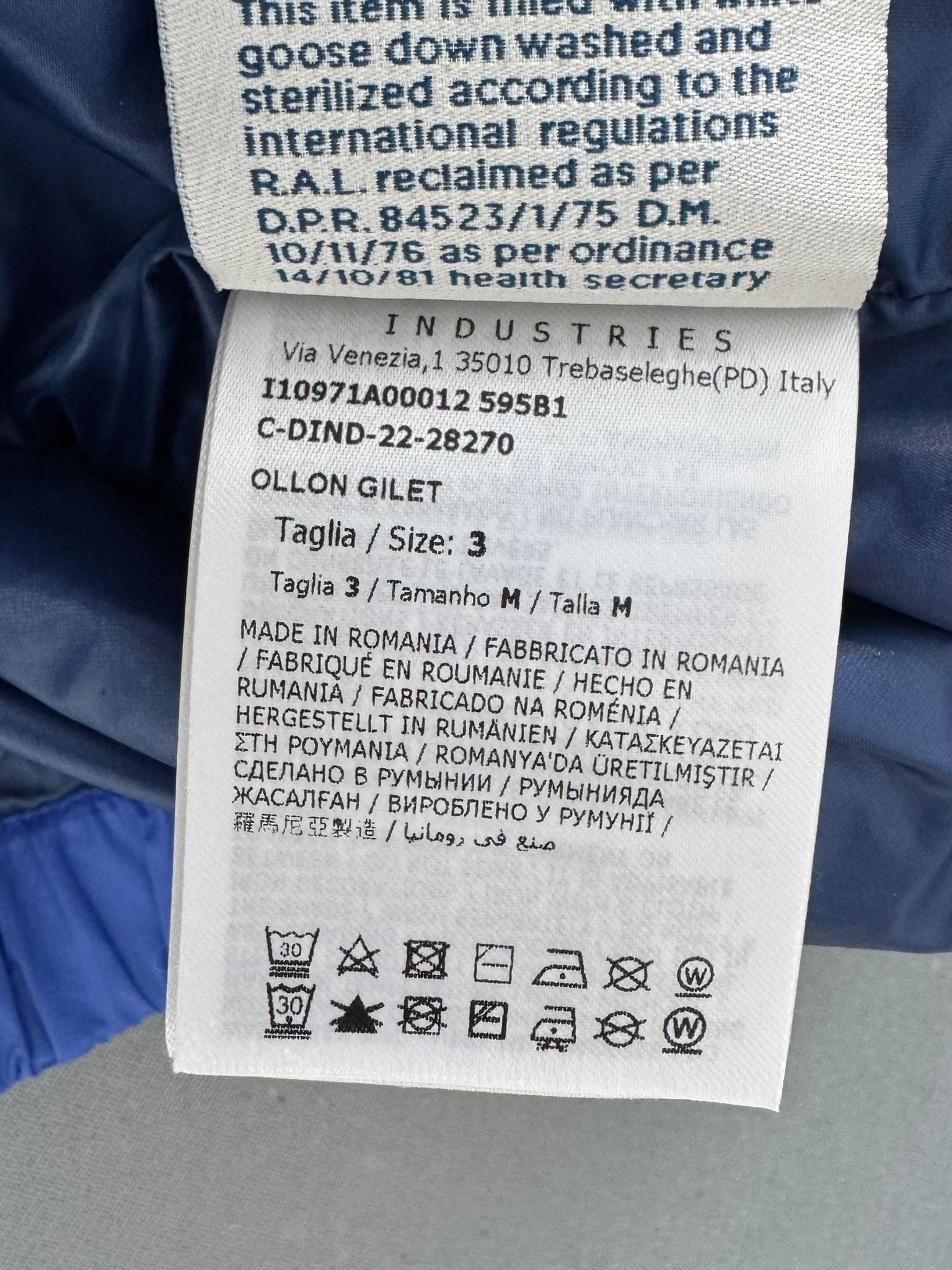 The padding is composed of 100% polyester, while the fill consists of 90% goose down and 10% feather, ensuring optimal warmth and insulation.
